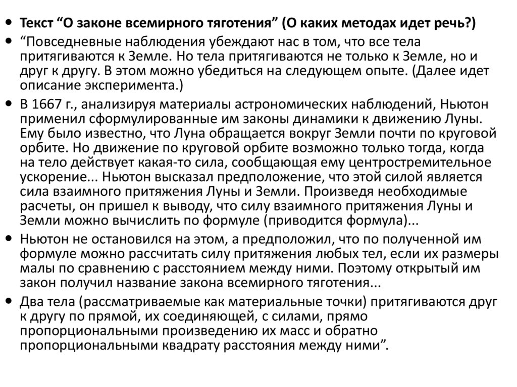 Текст “О законе всемирного тяготения” (О каких методах идет речь?)“Повседневные наблюдения убеждают нас в том, что все тела