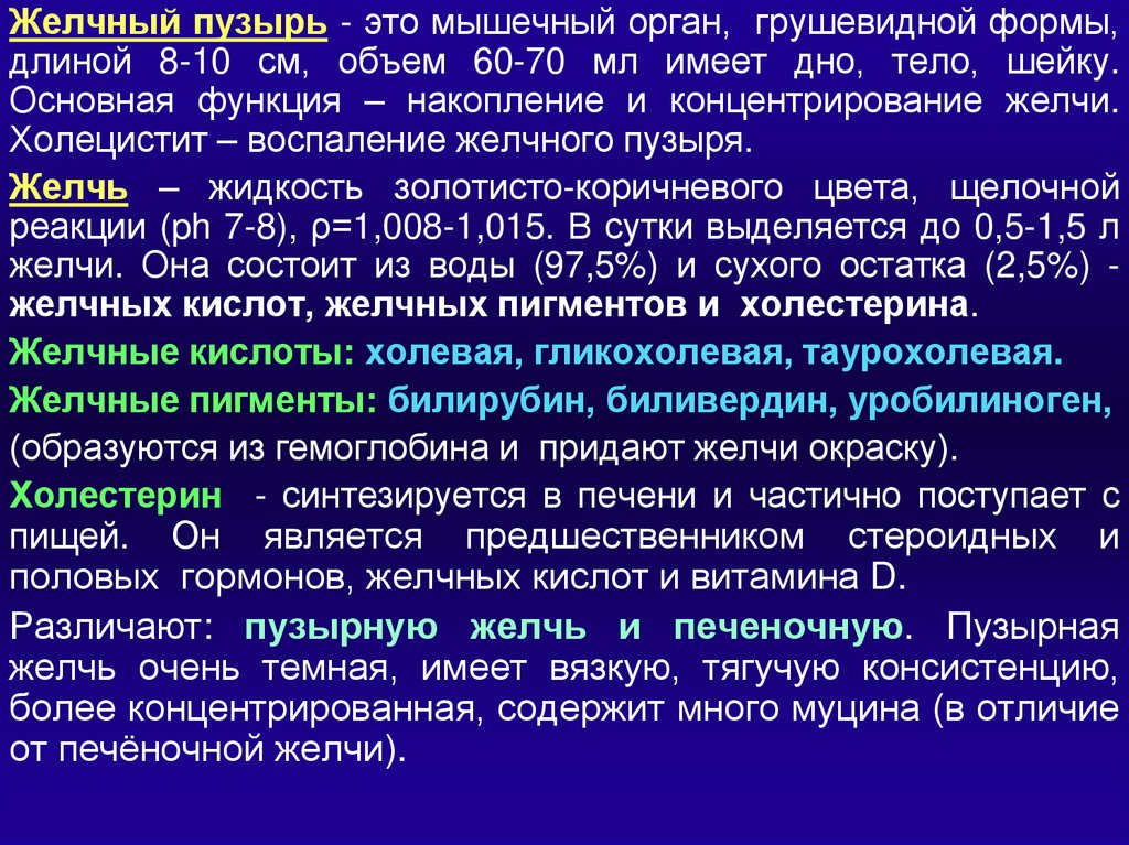 желчи. Она состоит из воды (97,5%) и сухого остатка (2,5%) желчных кислот, желчных пигментов и холестерина.