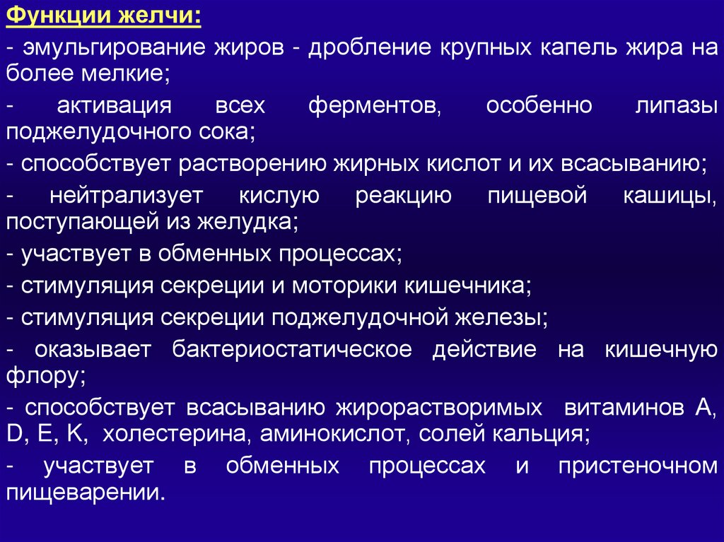Функции желчи:- эмульгирование жиров - дробление крупных капель жира на
