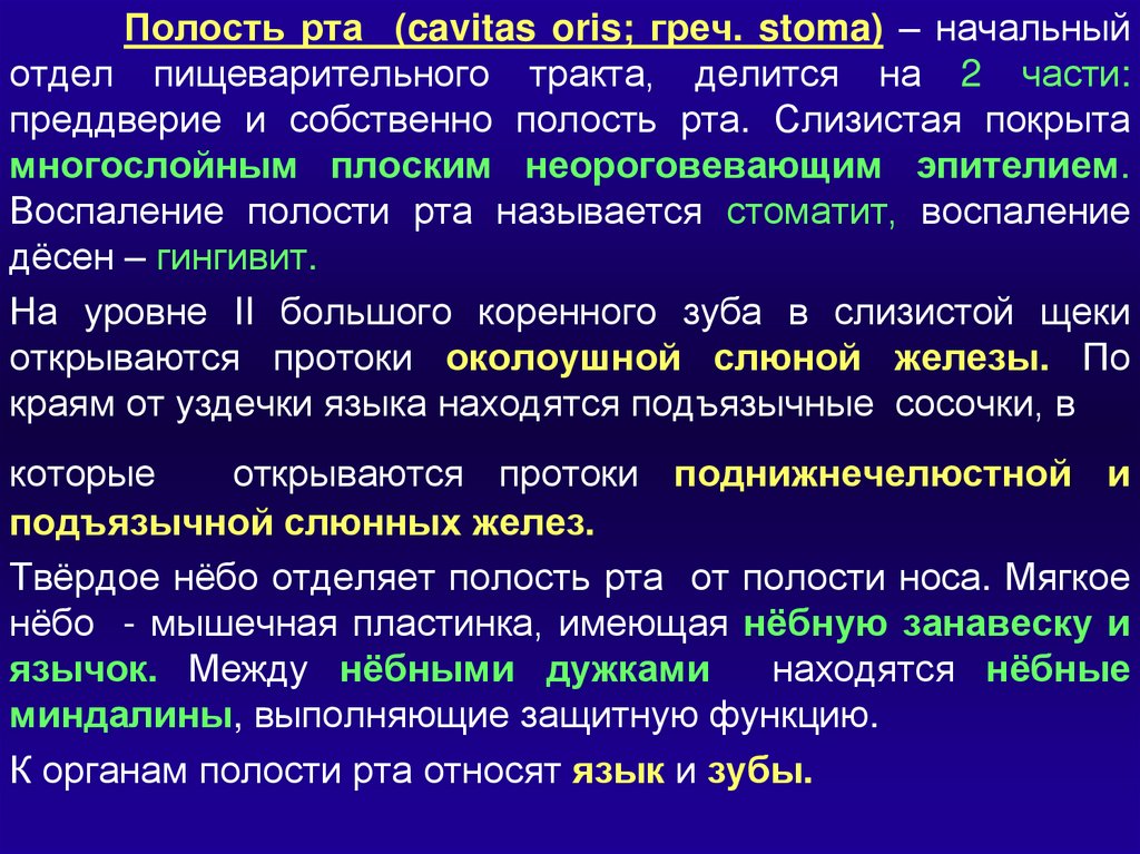 Полость рта (cavitas oris; греч. stoma) – начальныйотдел пищеварительного тракта, делится на 2 части: