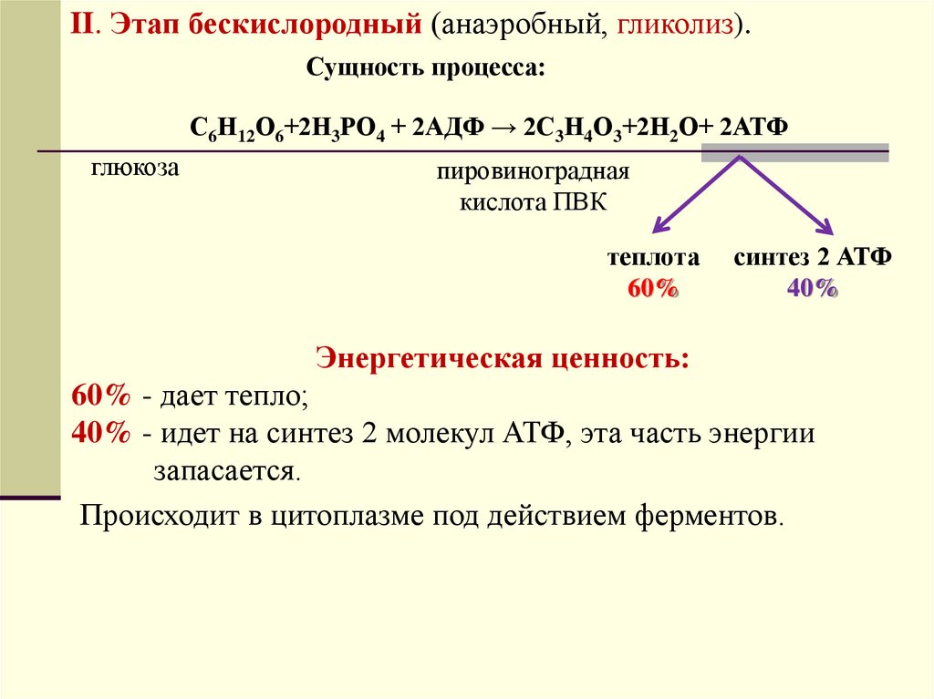 1. С6Н12О6 + 2АДФ + 2Н3РО4 = 2С3Н6О3 + 2АТФ+2Н2О