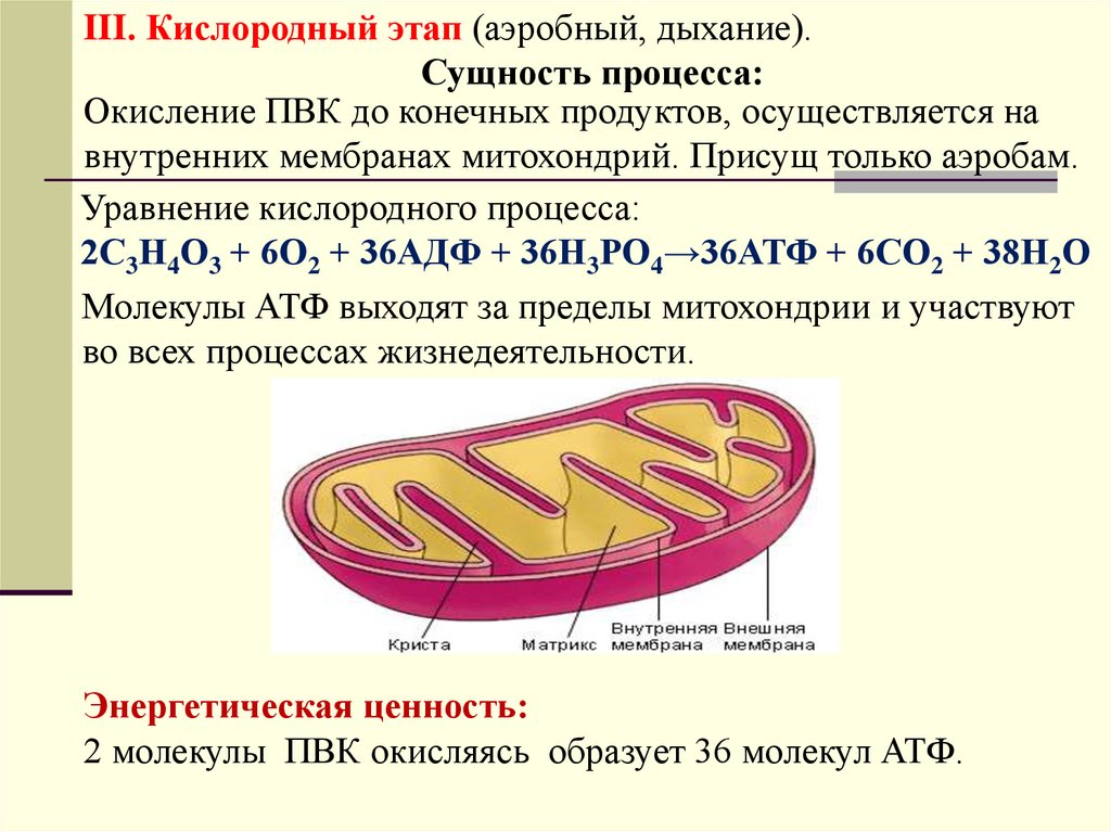 III. Кислородный этап (аэробный, дыхание).Сущность процесса: