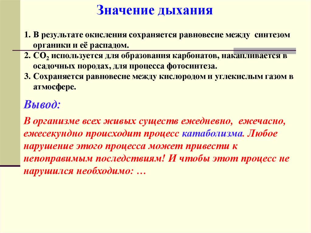 Значение дыхания1. В результате окисления сохраняется равновесие между синтезом