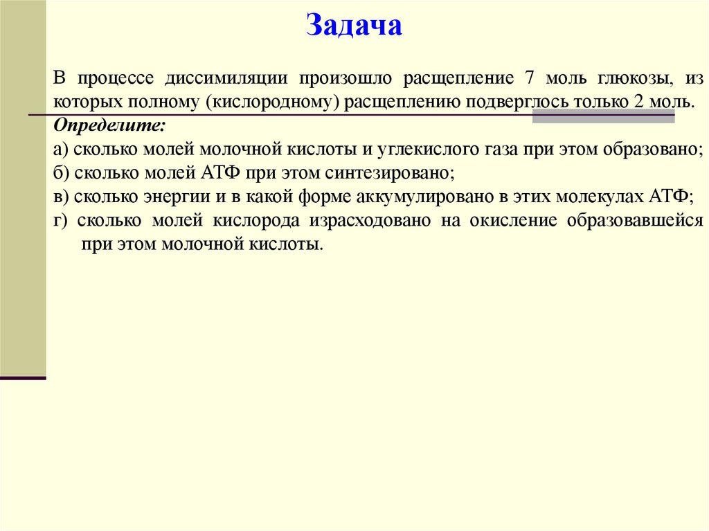 ЗадачаВ процессе диссимиляции произошло расщепление 7 моль глюкозы, из