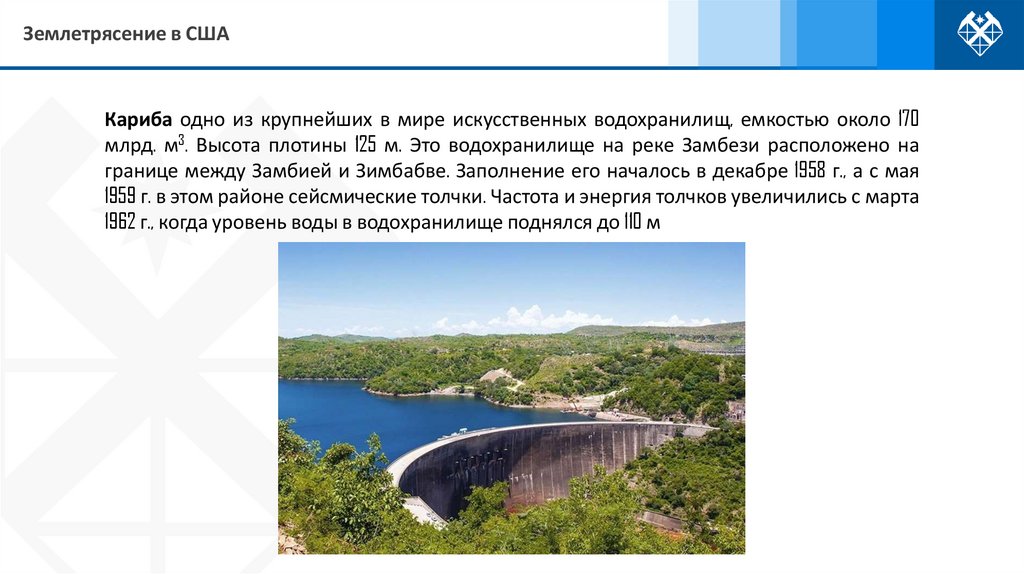 Землетрясение в СШАКариба одно из крупнейших в мире искусственных водохранилищ, емкостью около 170