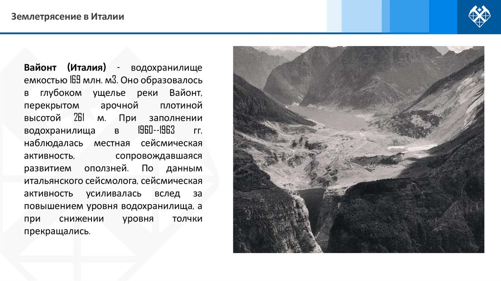 Землетрясение в ИталииВайонт (Италия) - водохранилище
