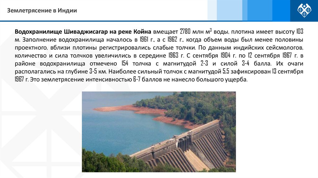 Землетрясение в ИндииВодохранилище Шиваджисагар на реке Койна вмещает 2780 млн м3 воды, плотина имеет высоту 103