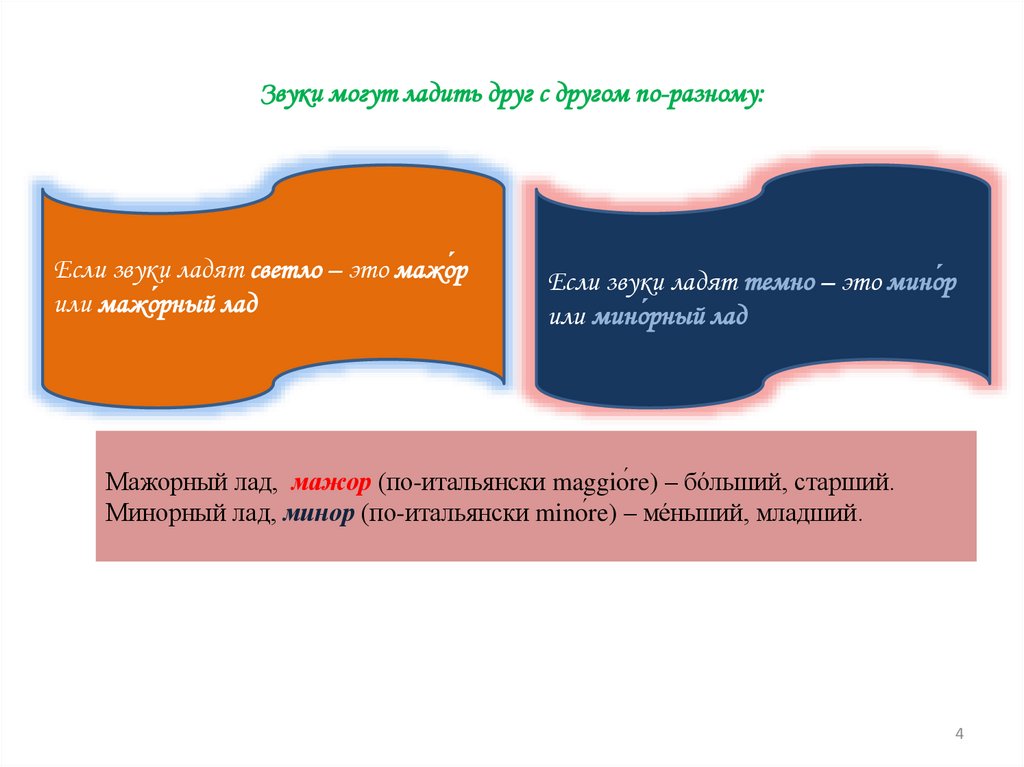 Звуки могут ладить друг с другом по-разному:Если звуки ладят светло – это мажо́р