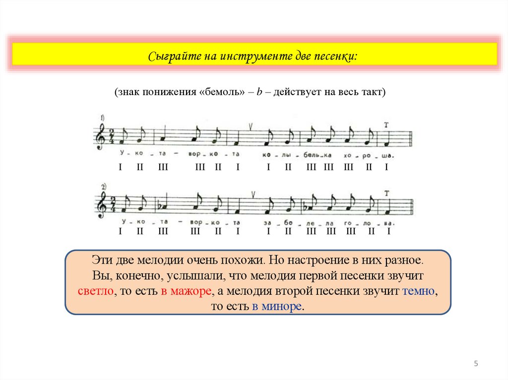 светло, то есть в мажоре, а мелодия второй песенки звучит темно,