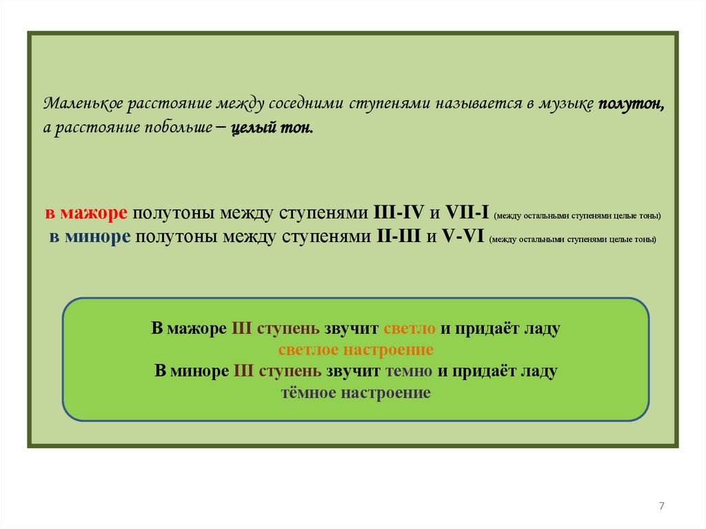 Маленькое расстояние между соседними ступенями называется в музыке полутон,а расстояние побольше – целый тон.