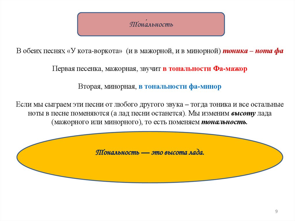 Тона́льностьВ обеих песнях «У кота-воркота» (и в мажорной, и в минорной) тоника – нота фа