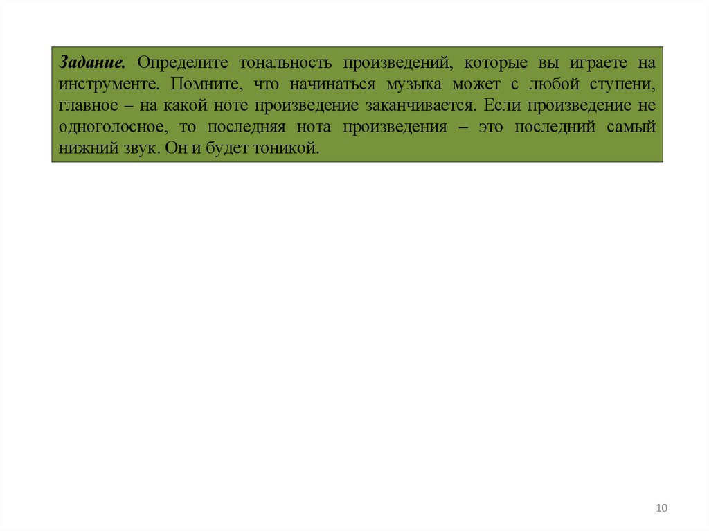 Задание. Определите тональность произведений, которые вы играете наинструменте. Помните, что начинаться музыка может с любой ступени,