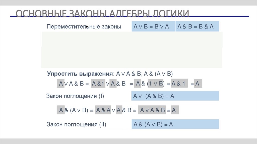 ОСНОВНЫЕ ЗАКОНЫ АЛГЕБРЫ ЛОГИКИПереместительные