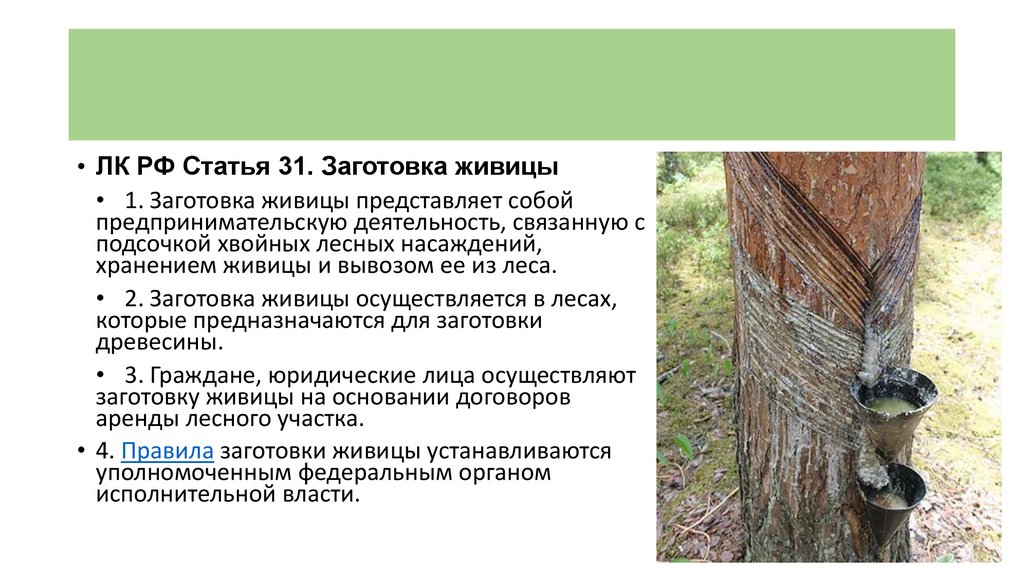 • ЛК РФ Статья 31. Заготовка живицы• 1. Заготовка живицы представляет собой