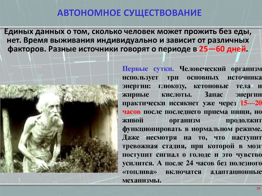 АВТОНОМНОЕ СУЩЕСТВОВАНИЕЕдиных данных о том, сколько человек может прожить без еды,
