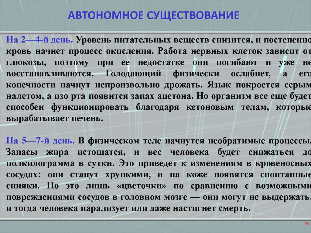 АВТОНОМНОЕ СУЩЕСТВОВАНИЕНа 2—4-й день. Уровень питательных веществ снизится, и постепенно
