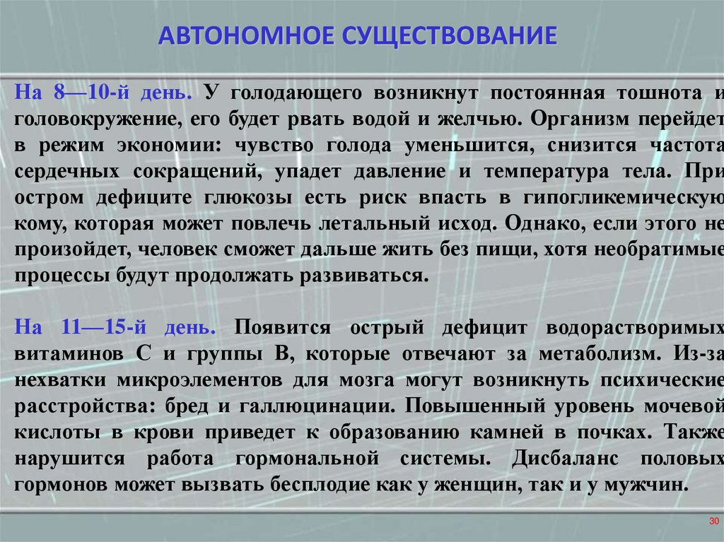 АВТОНОМНОЕ СУЩЕСТВОВАНИЕНа 8—10-й день. У голодающего возникнут постоянная тошнота и