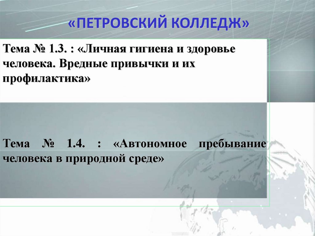 «ПЕТРОВСКИЙ КОЛЛЕДЖ»Тема № 1.3. : «Личная гигиена и здоровье