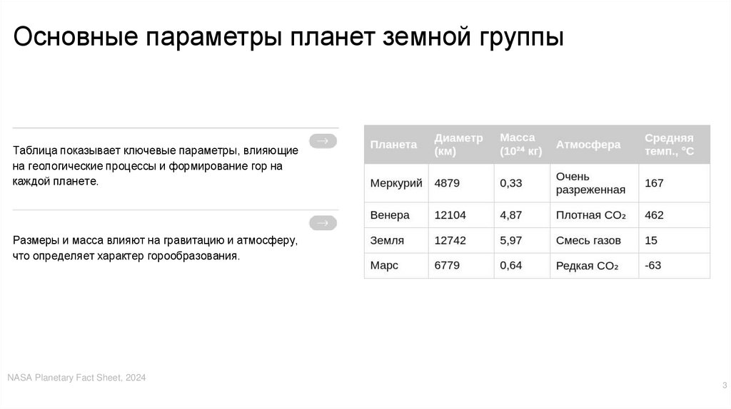 Основные параметры планет земной группыТаблица показывает ключевые параметры, влияющие