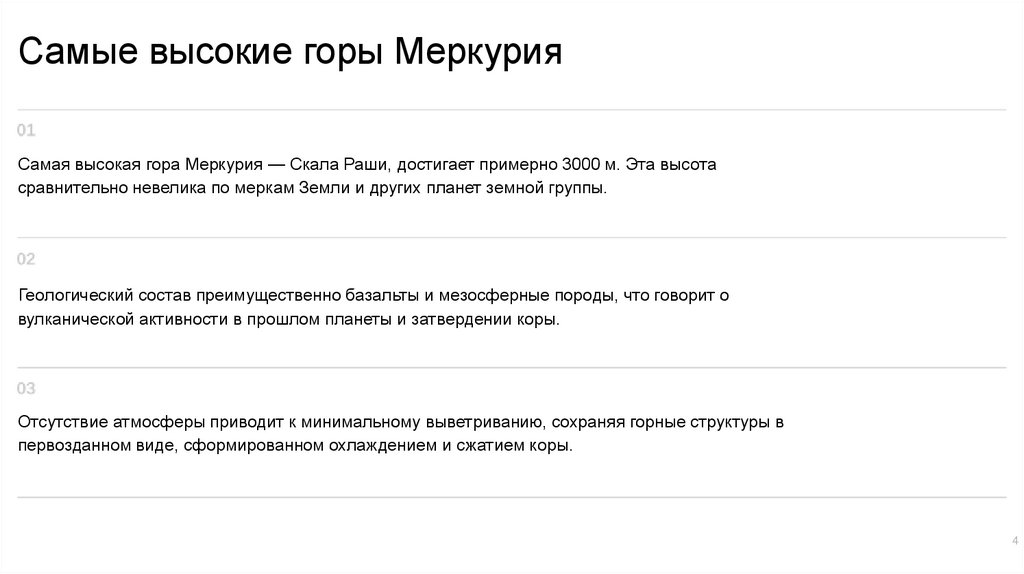 Самые высокие горы МеркурияСамая высокая гора Меркурия — Скала Раши, достигает примерно 3000 м. Эта высота