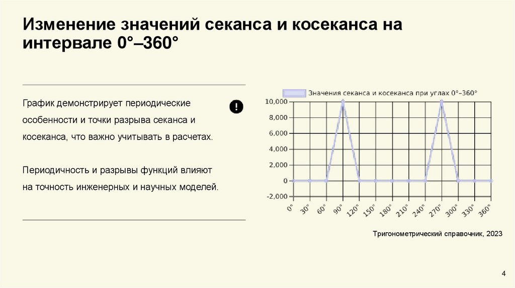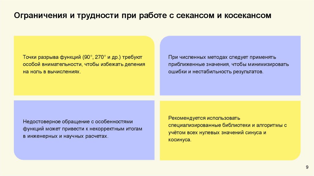 Ограничения и трудности при работе с секансом и косекансомТочки разрыва функций (90°, 270° и др.) требуют