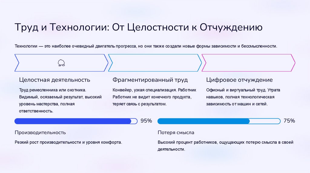 Труд и Технологии: От Целостности к ОтчуждениюТехнологии — это наиболее очевидный двигатель прогресса, но они также создали новые формы зависимости и бессмысленности.