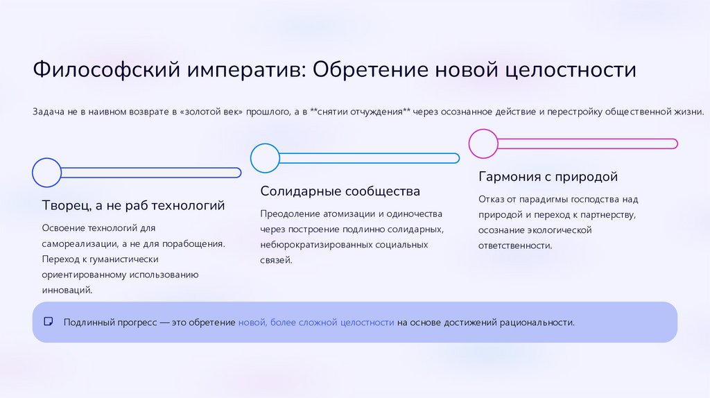 Философский императив: Обретение новой целостностиЗадача не в наивном возврате в «золотой век» прошлого, а в **снятии отчуждения** через осознанное действие и перестройку обще ственной жизни.