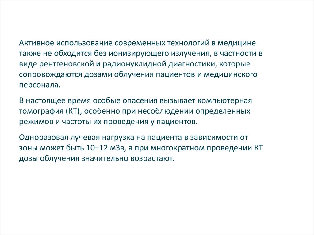 Активное использование современных технологий в медицинетакже не обходится без ионизирующего излучения, в частности в