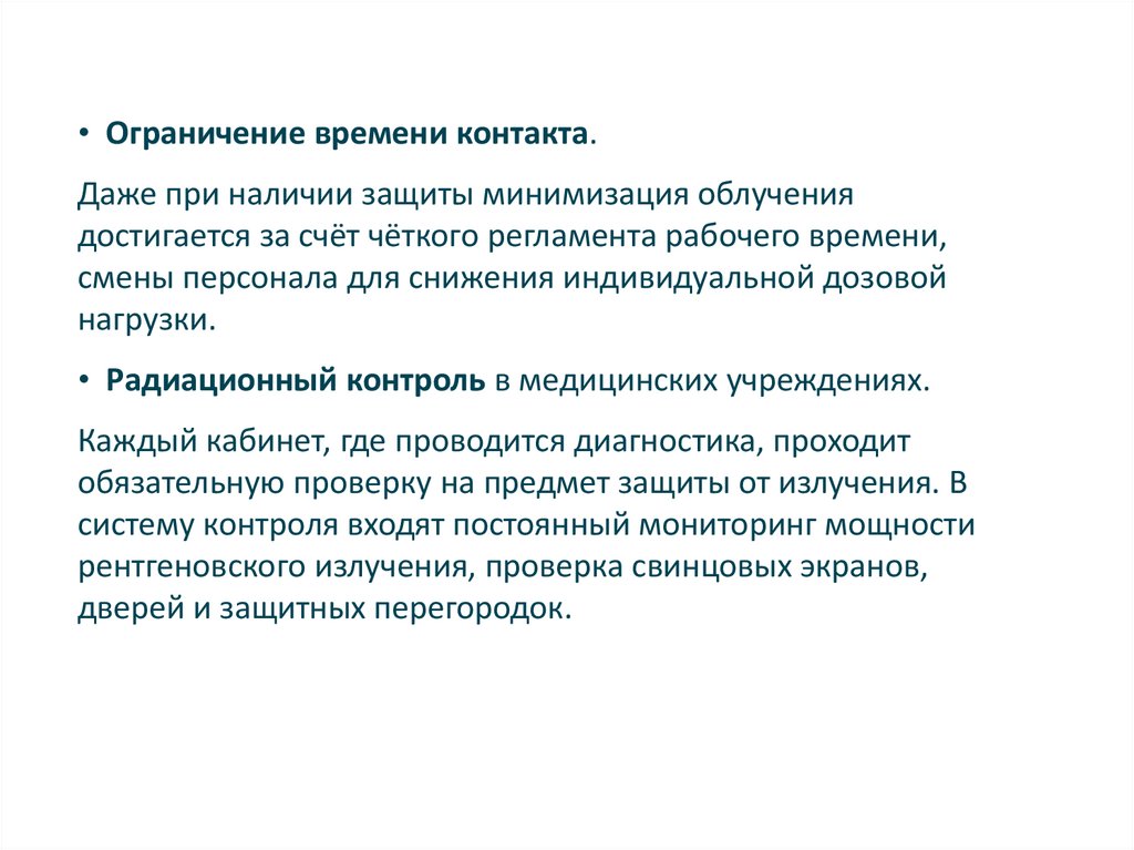 • Ограничение времени контакта.Даже при наличии защиты минимизация облучения
