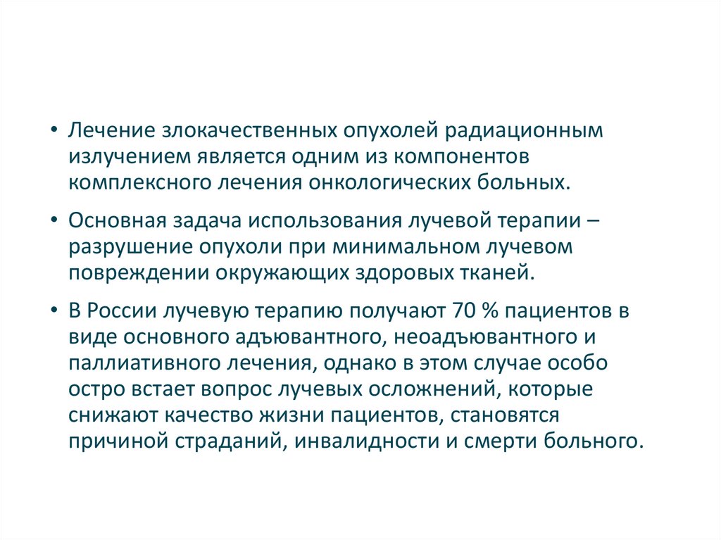• Лечение злокачественных опухолей радиационнымизлучением является одним из компонентов