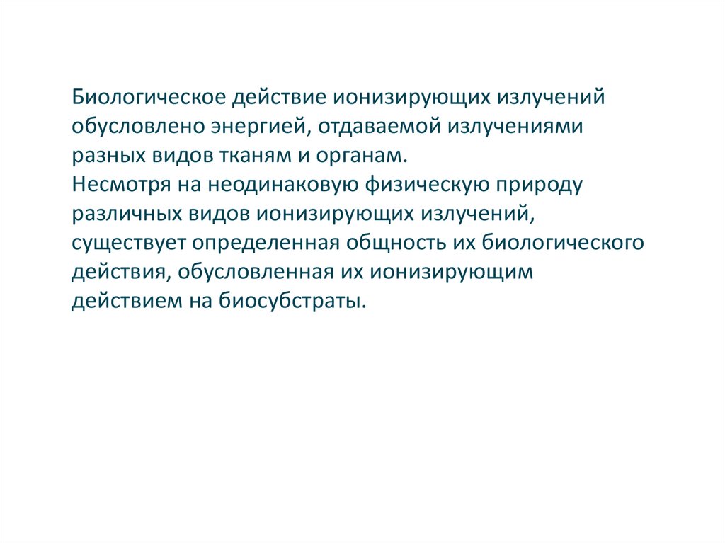 Биологическое действие ионизирующих излученийобусловлено энергией, отдаваемой излучениями