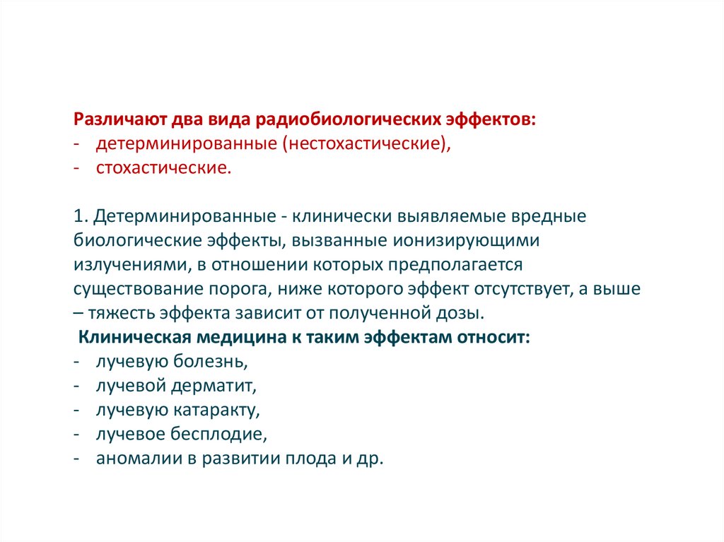 Различают два вида радиобиологических эффектов:- детерминированные (нестохастические),