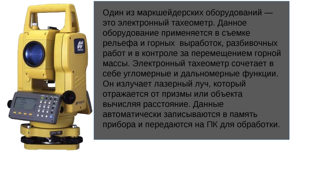 Один из маркшейдерских оборудований —это электронный тахеометр. Данное
