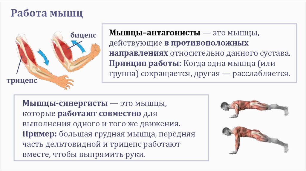 • Движения возможны благодаря взаимодействию мышц-антагонистов и