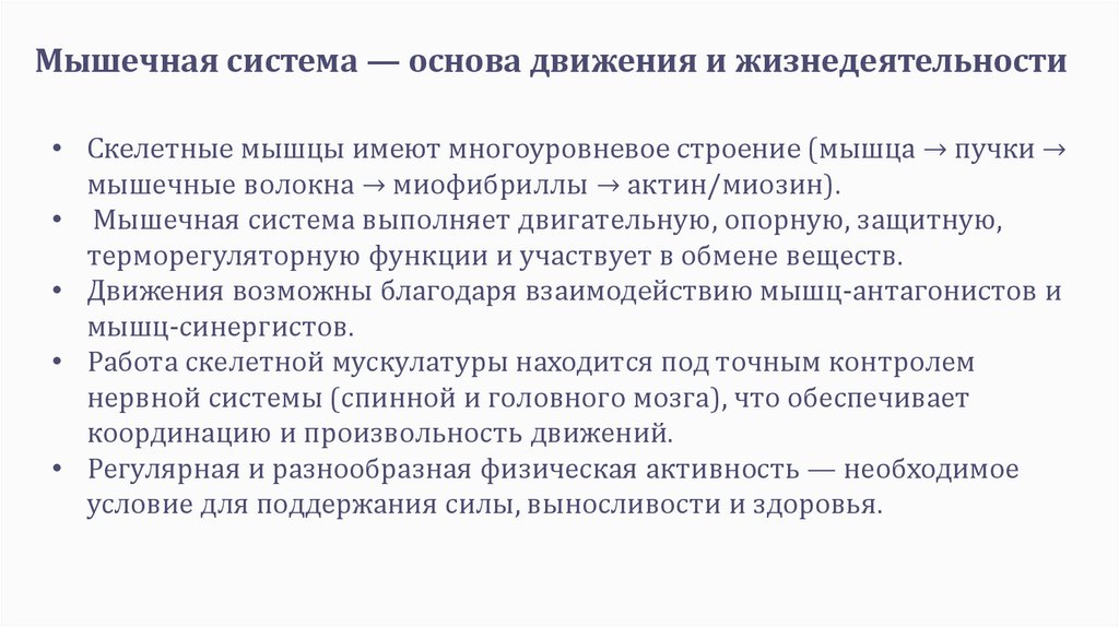 Мышечная система — основа движения и жизнедеятельности• Скелетные мышцы имеют многоуровневое строение (мышца → пучки →
