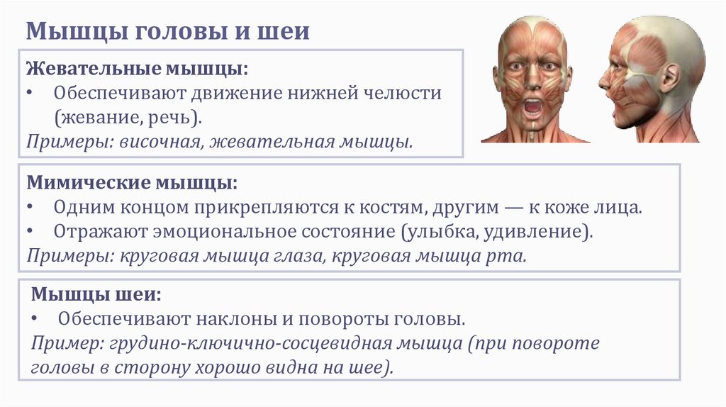 • Одним концом прикрепляются к костям, другим — к коже лица.