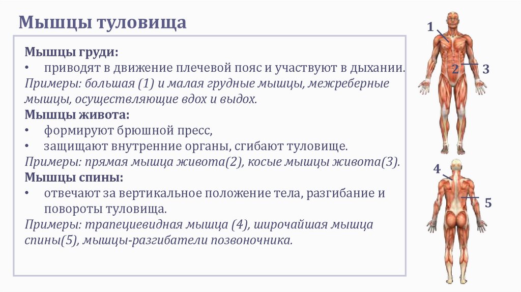 Примеры: прямая мышца живота(2), косые мышцы живота(3).