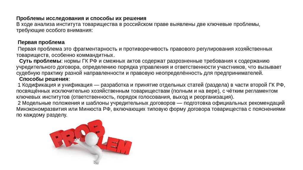 Проблемы исследования и способы их решенияВ ходе анализа института товарищества в российском праве выявлены две ключевые проблемы,
