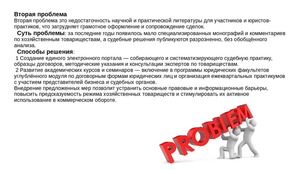 Вторая проблемаВторая проблема это недостаточность научной и практической литературы для участников и юристовпрактиков, что затрудняет грамотное оформление и сопровождение сделок.