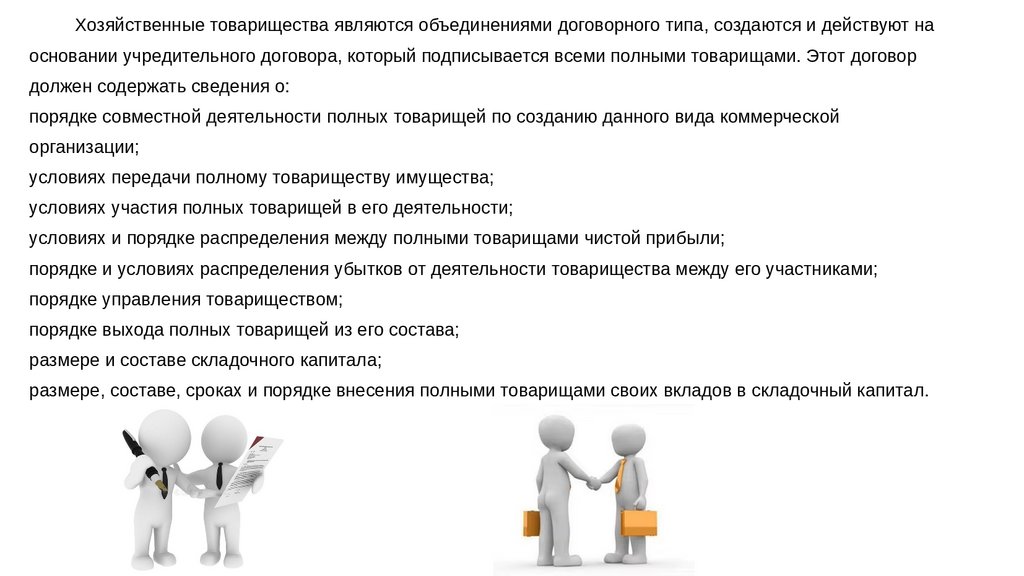 Хозяйственные товарищества являются объединениями договорного типа, создаются и действуют наосновании учредительного договора, который подписывается всеми полными товарищами. Этот договор