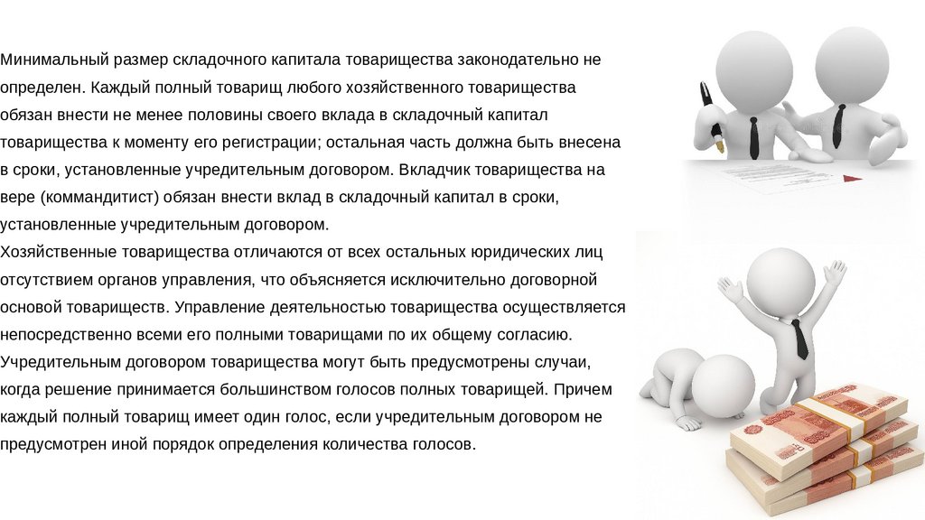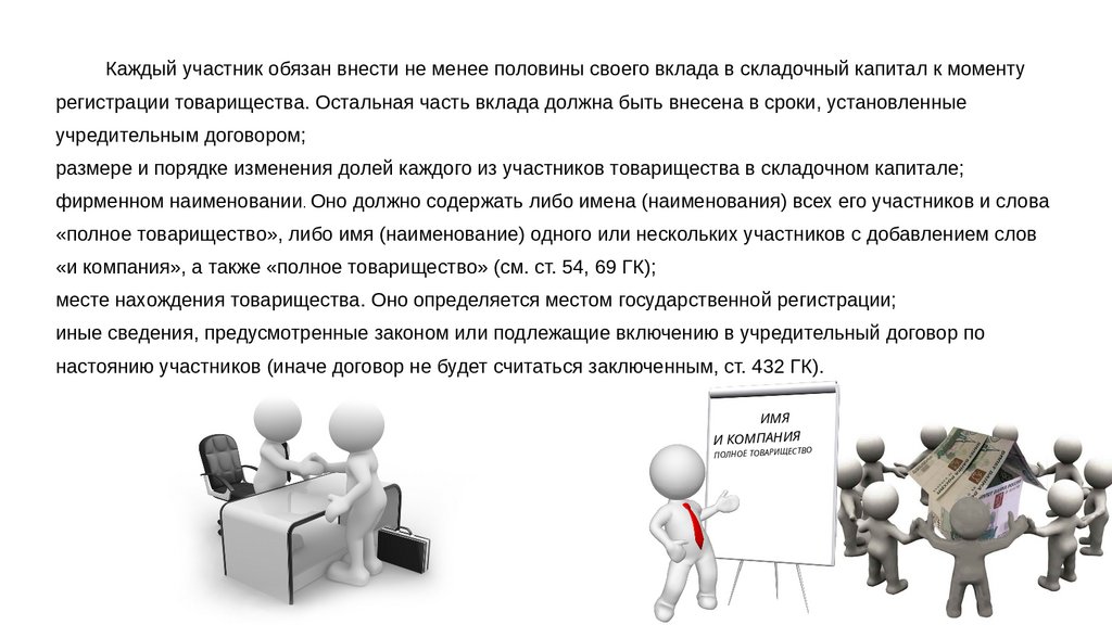 Каждый участник обязан внести не менее половины своего вклада в складочный капитал к моментурегистрации товарищества. Остальная часть вклада должна быть внесена в сроки, установленные