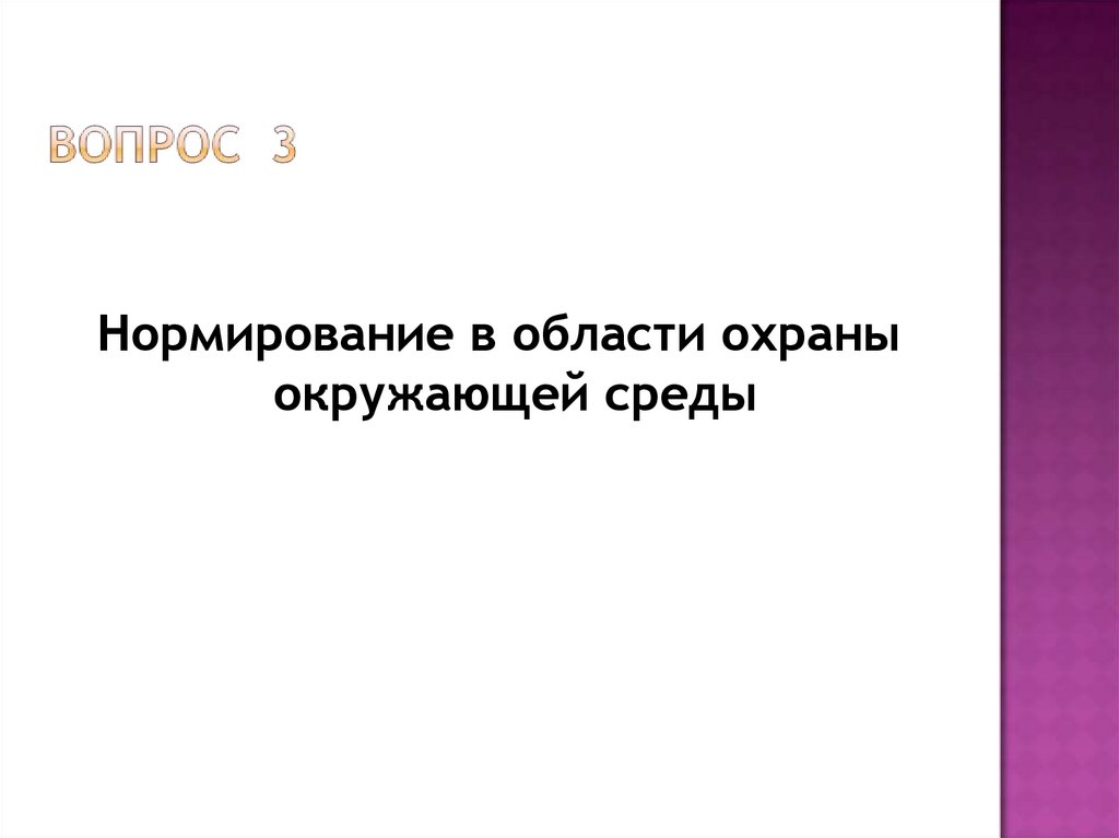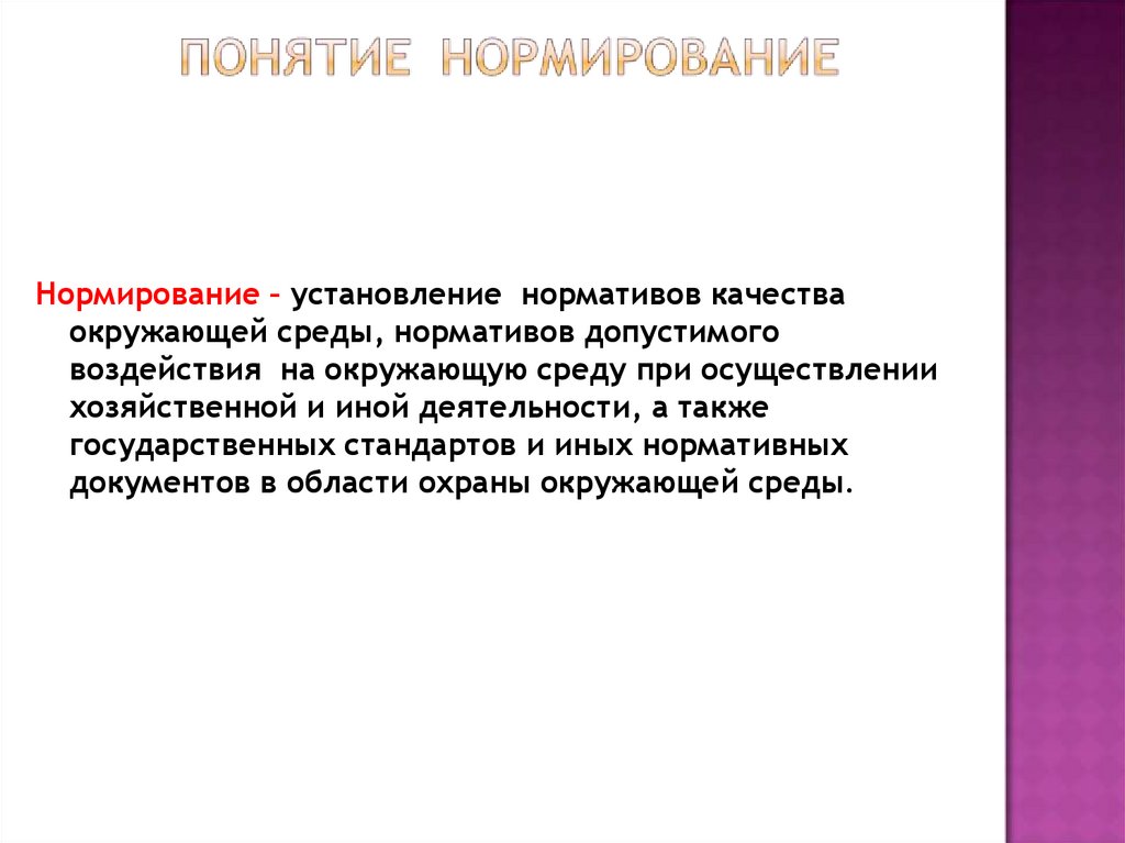Нормирование – установление нормативов качестваокружающей среды, нормативов допустимого