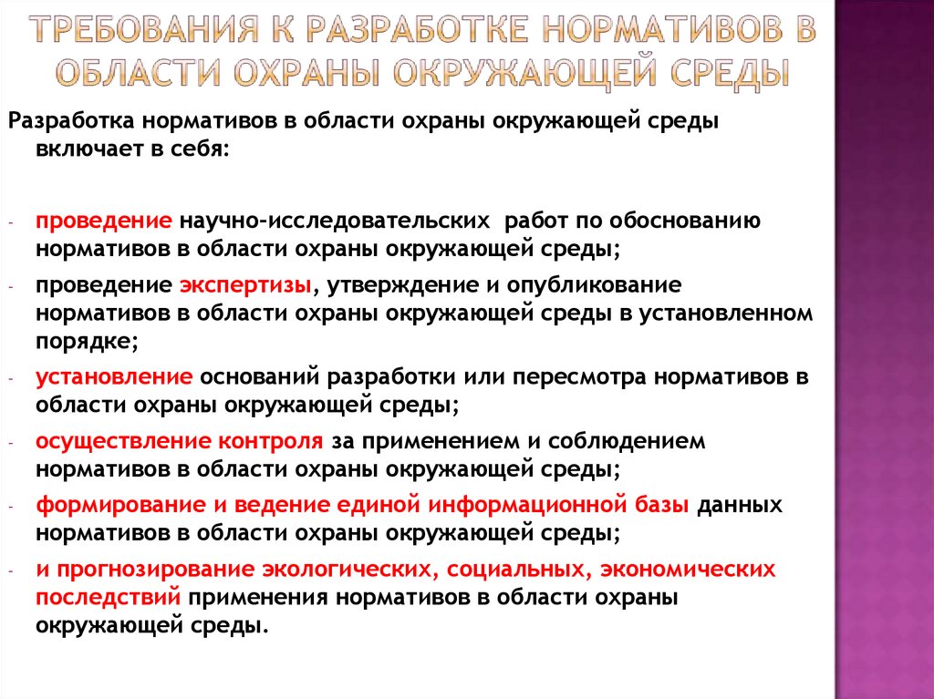 Разработка нормативов в области охраны окружающей средывключает в себя: