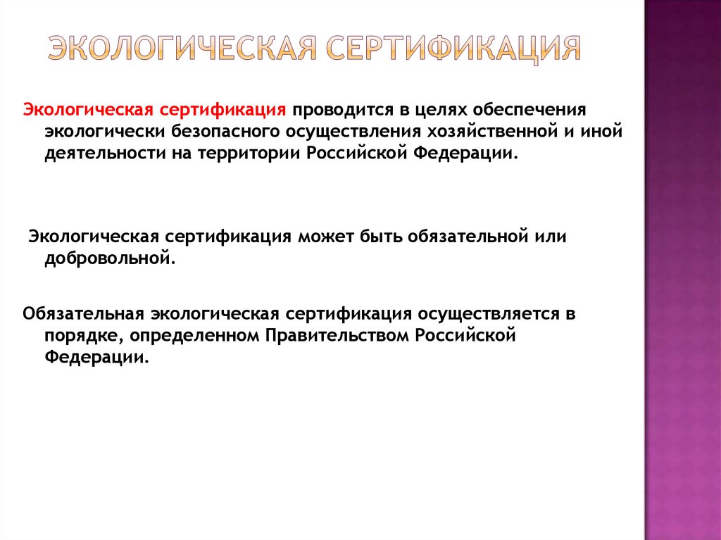 Экологическая сертификация проводится в целях обеспеченияэкологически безопасного осуществления хозяйственной и иной