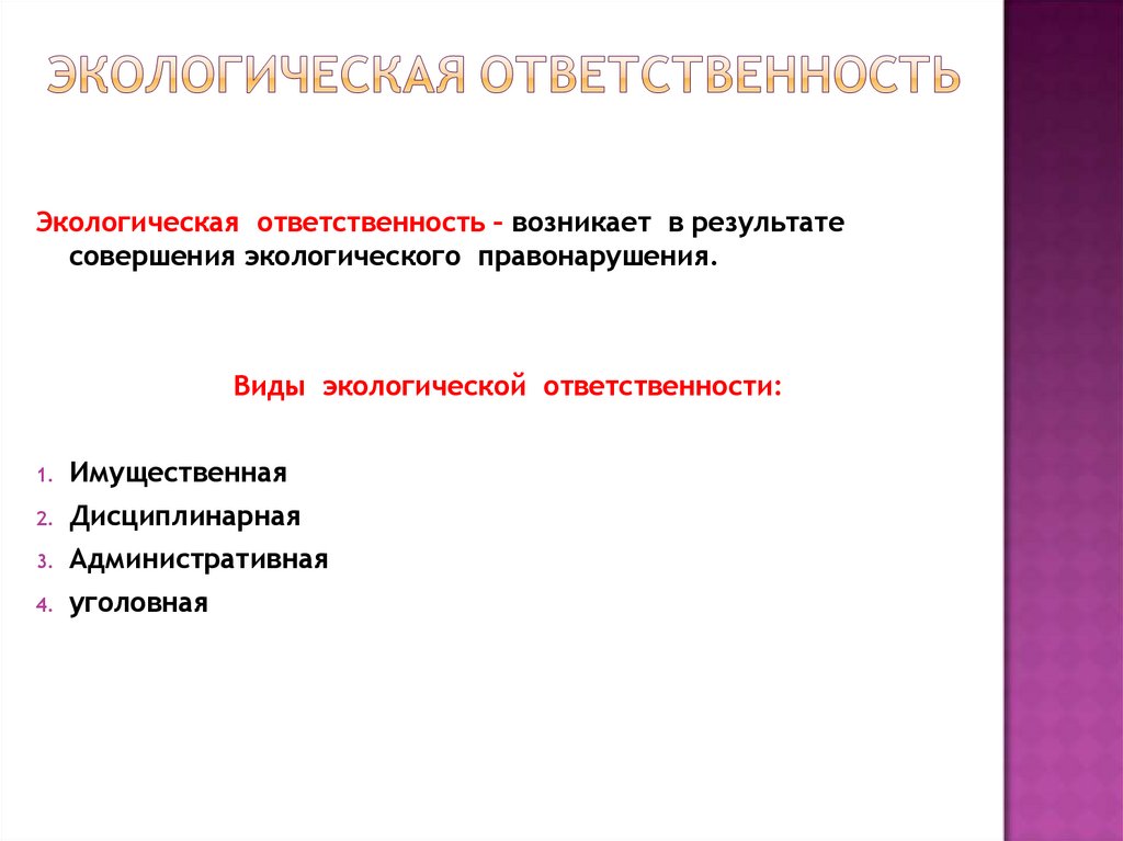 Экологическая ответственность – возникает в результатесовершения экологического правонарушения.