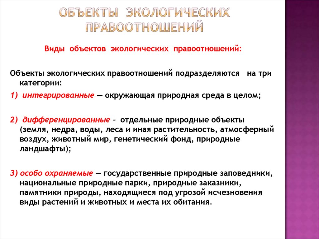 Виды объектов экологических правоотношений:Объекты экологических правоотношений подразделяются на три