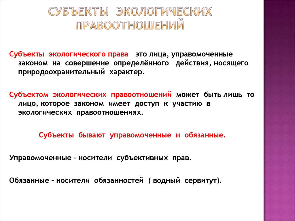 Субъекты экологического права это лица, управомоченныезаконом на совершение определённого действия, носящего