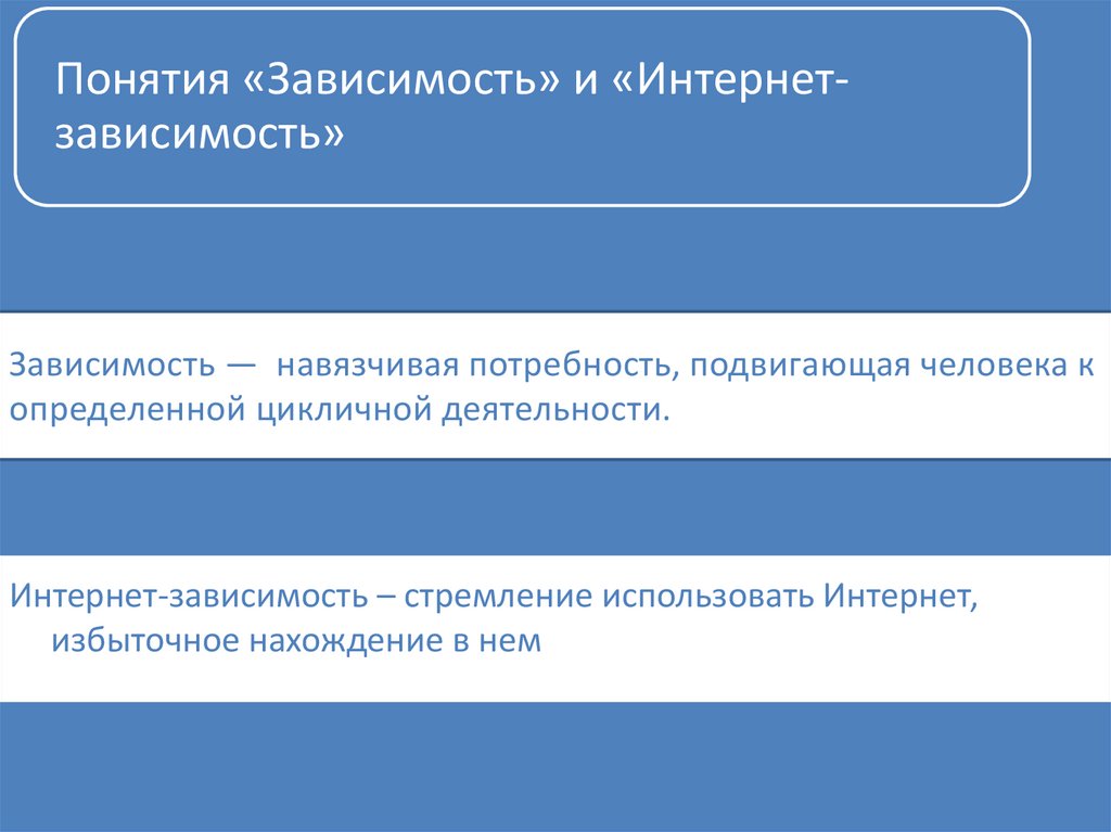 Понятия «Зависимость» и «Интернетзависимость»Зависимость — навязчивая потребность, подвигающая человека к