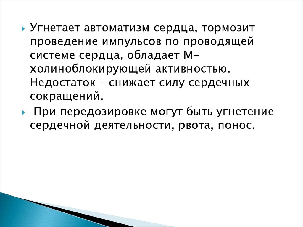 Угнетает автоматизм сердца, тормозитпроведение импульсов по проводящей