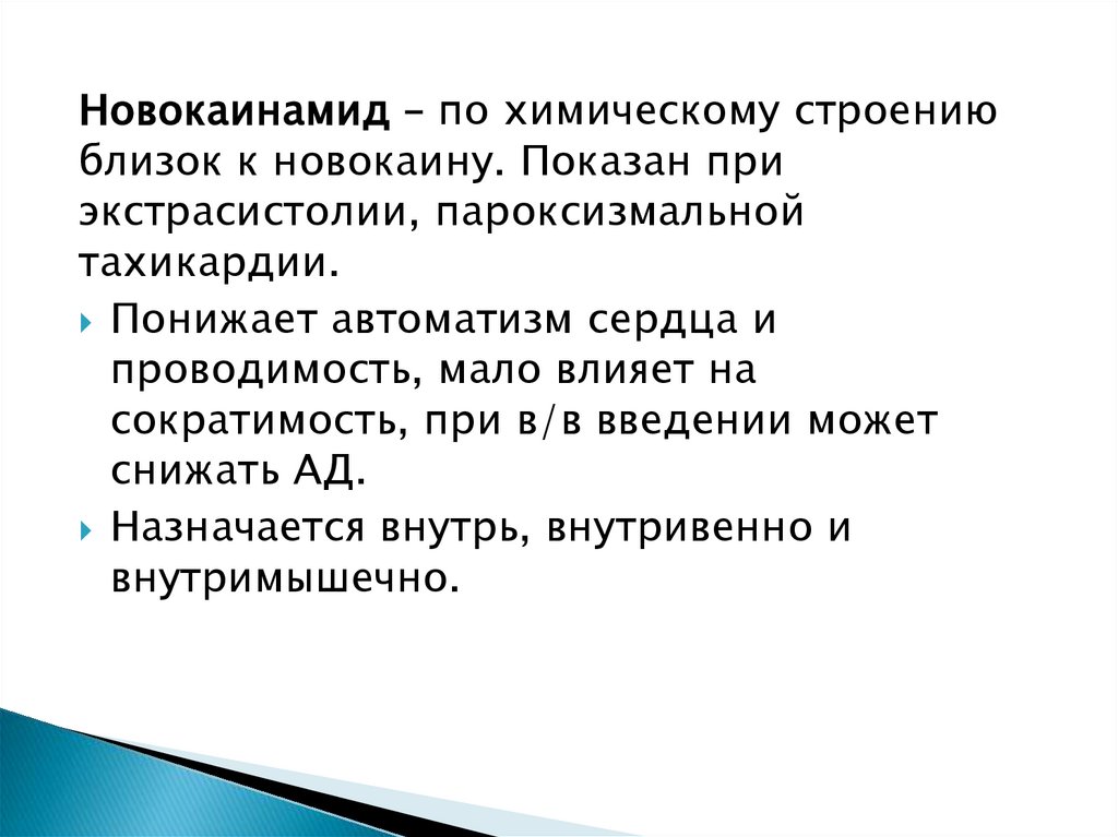 Новокаинамид – по химическому строениюблизок к новокаину. Показан при